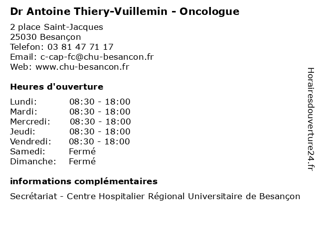 1 Dr Tristan Maurina - Oncologue (Distance: 0,00 km) 2 place Saint-Jacques, 25030 Besançon besançon, centre, chimiothérapie, de, dr, hospitalier, hémopathie, immunothérapie, maurina, oncologie, oncologue, régional, tristan, universitaire 2 Dr Guillaume Mouillet - Oncologue (Distance: 0,00 km) 2 place Saint-Jacques, 25030 Besançon besançon, centre, chimiothérapie, de, dr, guillaume, hospitalier, hémopathie, immunothérapie, mouillet, oncologie, oncologue, régional, universitaire 4 Armand Thiery Femme (Distance: 3,26 km) . Rue de Dole, 25000 Besançon accessoires, armand, boutique, femme, mode, thiery, vêtements 5 Armand Thiery (Distance: 4,32 km) - ZAC des Marnières, 25220 Chalezeule armand, boutique, magasin, mode, prêt à porter, thiery, vêtements 6 Menuiserie Vuillemin (Distance: 4,78 km) 9 Rue des Bruyères, 25220 Chalezeule manuel, menuiserie, menuisier, meuble, vuillemin |