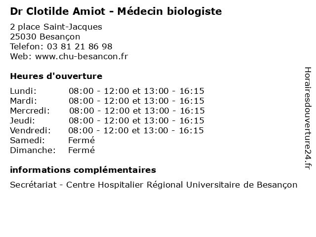 Termes de recherche pour Dr Clotilde Amiot - Médecin biologiste:de, besancon, biologie, centre, regional, amiot, hospitalier, universitaire, clotilde, médecin, dr, biochimie, biologiste, analyse, biochismiste |