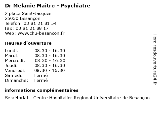 Termes de recherche pour Dr Melanie Maitre - Psychiatre:de, besancon, centre, folie, maître, melanie, regional, hospitalier, universitaire, psychiatrique, dr, psychiatrie, psychiatre |