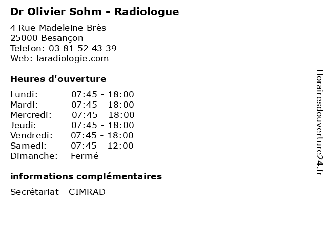 1 Dr Olivier Sohm - Radiologue (Distance: 3,86 km) 22 Rue des Deux Princesses, 25000 Besançon diagnostique, dr, imagerie, olivier, radiologie, radiologue, sohm, thérapeutique 2 Dr Olivier Monek - Chirurgien viscéral et digestif (Distance: 0,15 km) 33 Chemin des Tilleroyes, 25000 Besançon chirurgie, chirurgien, digestif, dr, et, general, monek, olivier, soins, viscéral 3 Dr Olivier Forterre - Chirurgien orthopédiste et traumatologue (Distance: 0,16 km) 33 Chemin des Tilleroyes, 25000 Besançon chirurgien, dr, et, forterre, olivier, orthopedie, orthopédique, orthopédiste, trauma, traumatologie, traumatologique, traumatologue 4 Adam Sohm - Masseur-kinésithérapeute (Distance: 1,96 km) 17 Rue Xavier Marmier, 25000 Besançon adam, docteur, kinésithérapeute, masseur, médecin, médecine, secrétariat, sohm 5 Dr Olivier Morel - Médecin nucléaire - secrétariat (Distance: 2,58 km) 3 Boulevard Fleming, 25000 Besancon dr, morel, médecin, médecins, médicaments, nucléaire, olivier, santé, secrétariat, spécialiste 6 Dr. Olivier Duret - Médecin généraliste (Distance: 2,88 km) 42 rue de Vesoul, 25000 Besançon consultation, docteur, dr., duret, généraliste, med, médecin, médecine, olivier, traitement |