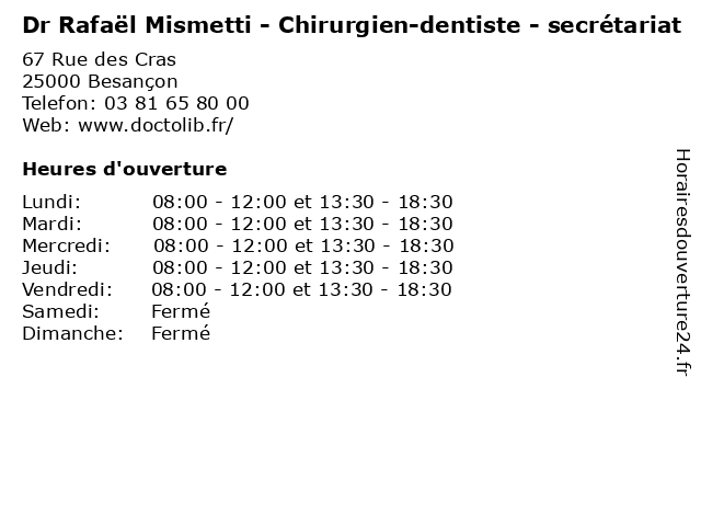 | Lundi | 08:00-12:00 et 13:30-18:30 |