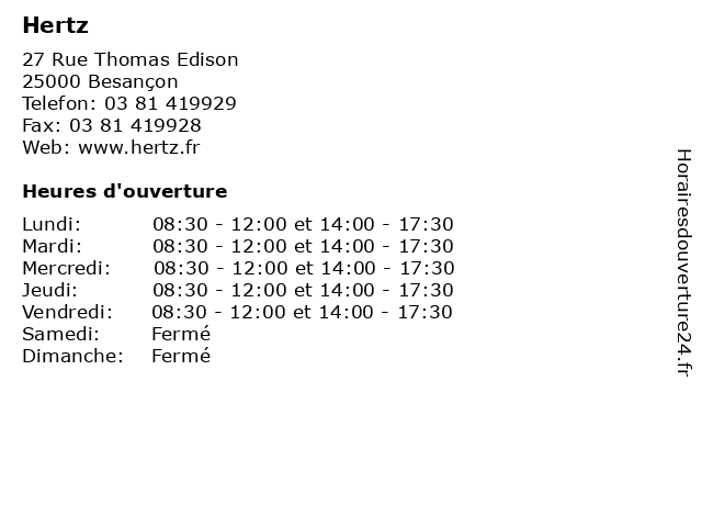 1 Hertz (Distance: 4,08 km) 5 Avenue Maréchal Foch, 25000 Besançon automobile, hertz, location de voiture, services de camionnage, voiture 2 Hertz - Station-service Total (Distance: 44,99 km) - Rue de la Fée Verte, 25300 Pontarlier hertz, service, station, station-service, total 3 Hertz - Station-service AGIP (Distance: 46,20 km) Zone Industrielle Les Charmes, 39500 Tavaux agence, agip, hertz, location, service, station, voiture 5 Rent A Car (Distance: 0,11 km) 20 Rue Thomas Edison, 25000 Besançon agence de location de véhicules, aller simple, car, location d'utilitaires, location de voitures, location de véhicules, rent, voitures sans permis 6 France Cars - Location utilitaire et voiture Besançon (Distance: 0,14 km) 22 Rue Thomas Edison, 25000 Besançon besançon, cars, et, france, location, utilitaire, voiture |