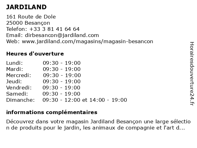 1 Jardiland (Distance: 4,70 km) 161 route de Dole, 25000 Besançon cosmetics, garden design, garden mineral, home decoration, jardiland, outdoors, scents, seed 2 Jardiland (Distance: 7,24 km) Rue des Sources, 25480 École-Valentin abris de jardin, aménagement du jardin, animaux de compagnie, art de la table, barbecue cuisine d'extérieur, bassin, bougies et senteurs, décoration d'intérieur, entretien et soin des végétaux, equipement du jardinier, jardiland, loisir plein air, luminaires, materiel et bricolage, mobilier de jardin, plantes d'intérieur, pots et contenants, semences et bulbes, végétaux d'extérieur 3 Jardiland - (En saison uniquement du 15/03 au 15/06 et du 15/10 au 25/12). (Distance: 7,24 km) 2 rue des sources, 25480 Ecole Valentin 15/03, 15/06, 15/10, 25/12, au, cosmetics, du, en, et, garden design, garden mineral, home decoration, jardiland, outdoors, saison, scents, seed, uniquement 4 L'esprit Jardiland Ecole Valentin (Distance: 7,27 km) 2 Rue des Sources, 25480 École-Valentin ecole, jardiland, l'esprit, valentin 5 Keria (Distance: 0,20 km) . Rue Joachim du Bellay, 25009 Besancon conseils, deco, keria, luminaires, muebles, services 6 Lapeyre "Drive" (Distance: 0,55 km) 4 rue françois villon, 25000 Besancon "drive", chaîne, lapeyre, salles de bains et l'aménagement intérieur et extérieur de la maison, spécialisée dans les cuisines |