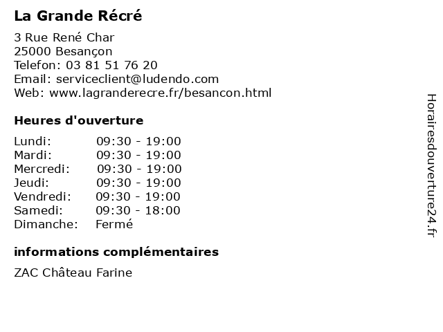 1 Tribunal de Grande Instance (Distance: 6,15 km) 1 rue Mégevand, 25019 Besançon administration, assoc, de, grande, instance, services, services publics, tribunal 2 Tribunal judiciaire de Besançon (Distance: 6,19 km) 1 rue Mégevand, 25017 Besancon administration, aux, besançon, bureau, d'aide, d'instance, de, du, grande, instance, judiciaire, publics, services, tribunal, victimes 3 Vival (Distance: 6,21 km) 2 Place du Maréchal de Lattre de Tassigny, 25000 Besançon alimentaire, by, casino, discount, distributeur, distribution, fruits, grande, hypermarché, légumes, supermarché, vival, épicerie 4 Les Jeux de la Comté (Distance: 6,22 km) 26 Rue Battant, 25000 Besançon comté, de, figurines, jeux, jouets, la, les 5 THE HOBBIES GATE (Distance: 10,50 km) 4 Rue Léon Foucault, 25870 Les Auxons concessionnaire de voitures de course, gate, hobbies, magasin de batteries de voiture, magasin de jouets, magasin de poupées, magasin général, matériel créatif et de loisirs, the 6 Médiathèque Intercommunale (Distance: 19,94 km) 9 rue Richebourg, 39350 Gendrey cd, dvd, intercommunale, jeux videos, livres, médiathèque, revues |