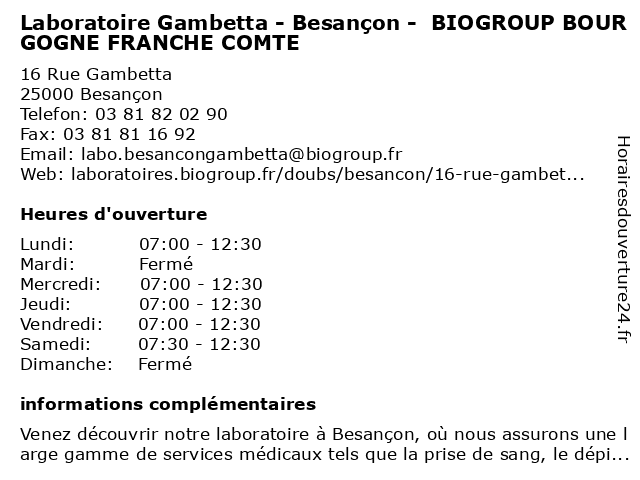 Termes de recherche pour Laboratoire Gambetta - Besançon - BIOGROUP BOURGOGNE FRANCHE COMTE:besancon, comte, laboratoire, gambetta, bourgogne, franche, biogroup, dépistages, laboratoire de diagnostic |