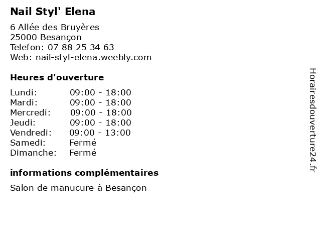 3 Nail's Design (Distance: 21,65 km) 3 Rue de la Mairie, 25110 Séchin beauté, design, esthétique, manucure, nail's, salon, spa 4 Styl & Caract'Hair (Distance: 37,81 km) 5 rue du Chalet, 25270 Chapelle-d'Huin brushing, caract'hair, coiffeur, coiffure, coloration, coupe, shampooing, styl 6 Rose & Dy (Distance: 0,13 km) 22 Boulevard Léon Blum, 25000 Besançon beauté, coiffure, dy, rose, salon, style |