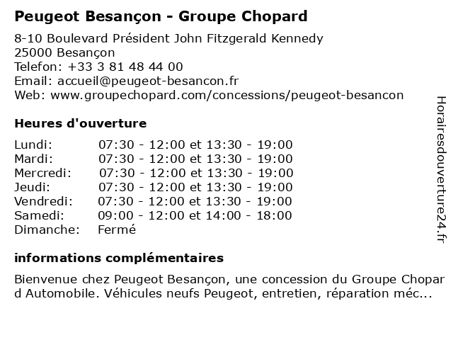 1 Peugeot - Groupe Chopard - Véhicule neuf (Distance: 0,06 km) 8-10 Boulevard Kennedy, 25000 Besançon automobiles, chopard, concéssionnaire, garage, groupe, motos, neuf, peugeot, véhicule 2 Peugeot - Groupe Chopard - Véhicule occasion (Distance: 0,06 km) 8-10 Boulevard Président John Fitzgerald Kennedy, 25000 Besançon automobiles, chopard, concéssionnaire, d'occasio, garage, groupe, motos, occasion, peugeot, véhicule 3 Peugeot - Groupe Chopard - Pièces et accessoires (Distance: 0,06 km) 8-10 Boulevard President John Fitzgerald Kennedy, 25000 Besançon accessoire, accessoires, automobiles, chopard, concéssionnaire, de, et, garage, groupe, motos, peugeot, pièce, pièces, rechange 4 BYD Besançon - Groupe Chopard (Distance: 0,23 km) 6 Boulevard Président John Fitzgerald Kennedy, 25000 Besançon besançon, byd, chopard, groupe 5 Le Groupe Darty - Car Park (Distance: 1,84 km) . Maréchal Leclerc Square, 25000 Besançon automobile, car, darty, groupe, le, park, parking, services 6 Le Groupe Intermarché - Car park (Distance: 2,41 km) - Boulevard Léon Blum, 25000 Besancon car, car parking, groupe, intermarché, le, park, services |