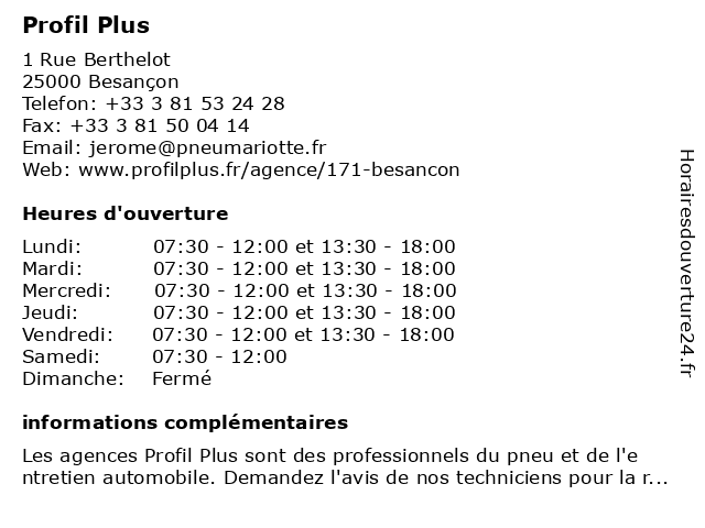 | Lundi | 07:30-12:00 et 13:30-18:00 |