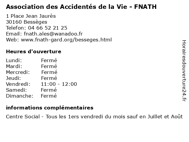 1 Association des Accidentés de la Vie - FNATH (Distance: 3,19 km) 14 Rue du Village - Mairie, 30160 Gagnières accidents, accidentés, association, de, des, du, fnath, gard, groupement, la, vie 2 Association des Accidentés de la Vie - FNATH (Distance: 10,28 km) 13 Rue Anatole France, 30110 La Grand-Combe accidents, accidentés, association, de, des, du, fnath, gard, groupement, la, vie 3 Association des Accidentés de la Vie - FNATH (Distance: 19,10 km) 1 Rue Balore - Residence Balore, 30100 Alès accidents, accidentés, association, de, des, du, fnath, gard, groupement, la, vie 4 CLCV - Consommation, Logement et Cadre de Vie (Distance: 8,76 km) - Avenue du Docteur Bastide, 30500 Saint-Ambroix association, cadre, clcv, consommateurs, consommation, de, environnement, et, logement, vie 6 La Vie Claire (Distance: 17,34 km) 58 Chemin du Viget, 30100 Alès alimentation bio, claire, la, magasins bio, produits bio, vie |