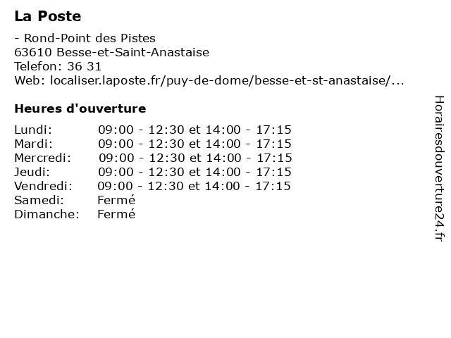 2 La Poste (Distance: 7,26 km) - Place de la Mairie, 63790 Chambon-sur-Lac agence, assurance, banque, banque postale, bureau de poste, chronopost, colis, courrier, dps, expéditions internationales, la, point, postale, poste, relais, timbres, téléphonie, ups, western union 3 La Poste (Distance: 9,30 km) - Place de l'Église, 63680 Chastreix agence, assurance, banque, banque postale, bureau de poste, chronopost, colis, courrier, dps, expéditions internationales, la, point, postale, poste, relais, timbres, téléphonie, ups, western union 4 La Poste (Distance: 11,40 km) - Le Bourg, 63610 Valbeleix agence, assurance, banque, banque postale, bureau de poste, chronopost, colis, courrier, dps, expéditions internationales, la, point, postale, poste, relais, timbres, téléphonie, ups, western union 5 La Poste (Distance: 12,77 km) - Le Bourg, 63950 Saint-Sauves-d'Auvergne colis, express chronopost, expédition, la, poste, réexpédition internationale, service, suivi du courrier 6 La Poste (Distance: 12,77 km) - Le Bourg, 63950 Saint-Sauves-d'Auvergne agence, assurance, banque, banque postale, bureau de poste, chronopost, colis, courrier, dps, expéditions internationales, la, point, postale, poste, relais, timbres, téléphonie, ups, western union |