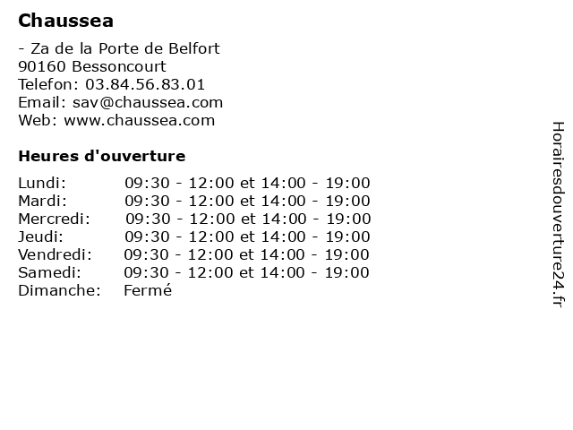 1 Chaussea (Distance: 4,65 km) 7 Rue de la République, 90400 Danjoutin accessoires, chaussea, chaussures, cuir, femmes, hommes 2 Chaussea (Distance: 12,92 km) - Zac en Salamon, 70400 Héricourt accessoires, chaussea, chaussures, cuir, femmes, hommes 3 Chaussea (Distance: 17,32 km) s/n ZAC du Pied des Gouttes, 25200 Montbéliard accessoires, adulte, chaussea, chaussures, enfant 4 Chaussea (Distance: 17,55 km) - Zac du Pied des Gouttes, 25200 Montbéliard accessoires, chaussea, chaussures, cuir, femmes, hommes 5 Chaussea (Distance: 24,43 km) 7 rue de Givet, 68130 Altkirch accessoires, chaussea, chaussures, cuir, femmes, hommes 6 Chaussea (Distance: 33,81 km) n/a Route de Guebwiller, 68260 Kingersheim accessoires, chaussea, chaussures, cuir, femmes, hommes |