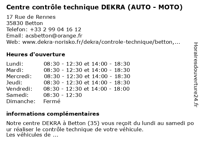 Description de l'entreprise :Préparer votre contrôle techniquePour préparer votre contrôle technique dans notre centre DEKRA de Betton, vous pouvez vérifier en amont différents points comme les pneumatiques, la visibilité, le niveau d'huile ou encore l'habitacle. Pour tout savoir, consultez notre vidéo. Voir l'offre |