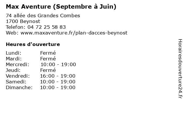 1 Max Aventure (Juillet et Août) (Distance: 0,00 km) 74 allée des Grandes Combes, 01700 Beynost août, aventure, d'été, enfants, et, juillet, loisirs, max, parc, vacances 2 Max Aventure (Vacances Scolaires/Jours Fériés) (Distance: 0,17 km) 74 allée des Grandes Combes, 01700 Beynost aventure, enfants, fériés, loisirs, max, parc, scolaires/jours, vacances 3 Max Call (Distance: 13,73 km) 21 grande rue de la Guillotière, 69007 Lyon bistrot, call, max, nourriture, restaurant 4 École primaire publique Max Barel (Distance: 15,62 km) 79 Boulevard Coblod, 69200 Vénissieux barel, ecole, education, maternelle, max, primaire, publique, services, école 5 Max Aventure (Périodes Scolaires) (Distance: 17,50 km) 13 rue du Bochet, 38230 Tignieu Jameyzieu aventure, enfants, hors, loisirs, max, parc, périodes, scolaires, vacances 6 Max Aventure (Vacances scolaires) (Distance: 17,50 km) 13 rue du bochet, 38230 Tignieu Jameyzieu aventure, enfants, loisirs, max, parc, scolaires, vacances |