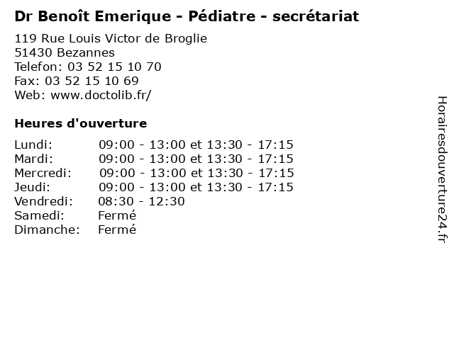 1 Dr Gwladys Delebarre - Pédiatre (Distance: 0,00 km) 119 Rue Louis Victor de Broglie,, 51430 Bezannes delebarre, dr, gwladys, médecins, médicaments, pédiatre, santé, secrétariat, spécialiste 2 Dr Corinne Petit - Pédiatre (Distance: 0,43 km) 119 Rue Louis Victor de Broglie, 51430 Bezannes consultation, corinne, docteur, dr, med, médecin, médecine, petit, pédiatre, traitement 3 Dr Christine Devulder - Pédiatre (Distance: 0,43 km) 119 Rue Louis Victor de Broglie, 51430 Bezannes christine, consultation, devulder, docteur, dr, med, médecin, médecine, pédiatre, traitement 4 Dr Marie-Alice Cossiez - Pédiatre (Distance: 0,43 km) 119 Rue Louis Victor de Broglie, 51430 Bezannes alice, consultation, cossiez, docteur, dr, marie, med, médecin, médecine, pédiatre, secrétariat, traitement 5 Dr Emeric Lambrecht - Pédiatre (Distance: 0,46 km) 109-119 Rue Louis Victor de Broglie, 51430 Bezannes consultation, docteur, dr, emeric, lambrecht, med, médecin, médecine, pédiatre, secrétariat, traitement 6 Dr Gwladys Delebarre - Pédiatre (Distance: 0,46 km) 109-119 Rue Louis Victor de Broglie, 51430 Bezannes consultation, delebarre, docteur, dr, gwladys, med, médecin, médecine, pédiatre, secrétariat, traitement |