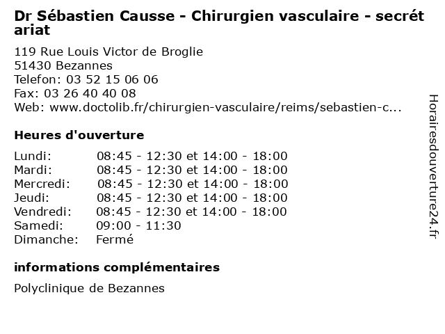 1 Dr Sébastien Causse - Chirurgien vasculaire - secrétariat (Distance: 0,00 km) 119 Rue Louis Victor de Broglie, 51430 Bezannes causse, chirurgien, consultation, docteur, dr, med, médecin, médecine, secrétariat, sébastien, traitement, vasculaire 2 Dr Sébastien Luneau - Chirurgien orthopédiste et traumatologue (Distance: 0,36 km) 1 Rue Jules Méline, 51430 Bezannes chirurgien, dr, et, luneau, orthopedie, orthopédique, orthopédiste, sébastien, trauma, traumatologie, traumatologique, traumatologue 3 Dr Sébastien Duval - Cardiologue (Distance: 0,47 km) 119 Rue Louis Victor de Broglie, 51430 Bezannes cardio, cardiologie, cardiologue, coeur, dr, duval, sebastien, sébastien 4 Dr Sébastien Kozal - Chirurgien urologue (Distance: 0,61 km) 89 Rue Louis Victor de Broglie, 51430 Bezannes chirurgie, chirurgien, dr, general, kozal, sebastien, soins, sébastien, urologue 5 Dr Sébastien Soize - Radiologue (Distance: 1,96 km) 45 Rue Cognacq Jay, 51100 Reims consultation, docteur, dr, med, médecin, radiologue, sebastien, soize, sébastien, traitement 6 Dr Sébastien Lavaquerie - Chirurgien maxillo-facial et stomatologue - secrétariat (Distance: 3,81 km) 2b Rue Passe Demoiselles, 51100 Reims chirurgien, consultation, docteur, dr, et, facial, lavaquerie, maxillo, med, médecin, médecine, secrétariat, stomatologue, sébastien, traitement |
