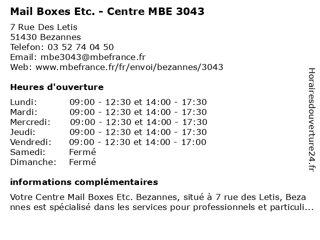 1 Mail Boxes Etc. (Distance: 0,00 km) 7 Rue des Letis, 51430 Bezannes boxes, centres, emballages, envois, etc., expéditions, mail 2 Dr Ahmed Mail - Médecin généraliste (Distance: 1,94 km) 10 Place Maurice Utrillo, 51100 Reims ahmed, consultation, docteur, dr, generaliste, généraliste, mail, med, medecin, médecin, traitement 3 Mail Boxes Etc. - Centre MBE 2697 (Distance: 5,16 km) 15 Rue Diderot, 51100 Reims 2697, boxes, centre, etc., fournisseur de matériel d'emballage, impression commerciale, ingénieur, mail, mbe 4 Homebox (Distance: 1,93 km) - Rue William Shakespeare, 51100 Reims affaire, agence, boxes, garde meubles, homebox, location 5 DHL Express (Heure limite de dépôt) (Distance: 5,61 km) 4 Rue des Artisans, 51350 Cormontreuil de, dhl, dépôt, export, express, heure, import, limite, logistique, mail 6 Mail Boxes Etc. - Centre MBE 3345 (Distance: 21,69 km) 6 Rue Des Joncs, 51200 Epernay 3345, boxes, centre, etc., fournisseur de matériel d'emballage, impression commerciale, location de boîtes postales, mail, mbe, service logistique |