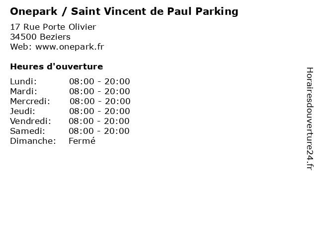 1 Onepark / Saint Vincent de Paul Parking (Distance: 0,04 km) 23 Rue Porte Olivier, 34500 Beziers de, onepark, parking, paul, saint, services, vincent 3 Parking Béziers Les Halles 2 - EFFIA (Distance: 0,03 km) 17 Rue Porte Olivier, 34500 Béziers béziers, effia, halles, les, parking 4 Onepark / Madeleine Parking (Distance: 0,09 km) 4 Rue Porte Olivier, 34545 Beziers madeleine, onepark, parking, services 5 Onepark / Les Halles - Madeleine Parking (Distance: 0,13 km) - Place Madeleine, 34545 Beziers halles, les, madeleine, onepark, parking, services 6 Onepark / Jean Moulin Parking (Distance: 0,37 km) - Avenue Georges Clemenceau, 34500 Beziers jean, moulin, onepark, parking, services |