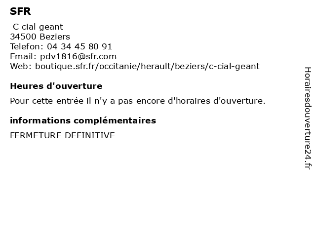 1 SFR (Distance: 1,19 km) . De Montımaran, 34500 Beziers beaute, cafe, chaussures, enfants, lingerie, mode femmes, mode hommes, restaurant, royaume, sfr, sport 2 Sfr (Distance: 1,58 km) 4 Avenue de la Voie Domitienne, 34500 Béziers internet, mobiles, sfr, téléphonie 3 SFR (Distance: 3,03 km) 3 Carrefour Hours, 34500 Beziers cafe, chaussures, enfants, homme, mode femme, restaurant, sfr 4 SFR (Distance: 3,47 km) - Avenue Du Président Wilson, 34500 Beziers abonnements de téléphonie mobile ou fixe fixe ou carte prépayée, accès internet haut débit ou la fibre optique ainsi que des abonnements à des bouquets de chaînes de télévision ., sfr, téléphones mobiles 6 SFR (Distance: 3,70 km) 3 Allées Paul Riquet, 34500 Beziers abonnements de téléphonie mobile ou fixe fixe ou carte prépayée, accès internet haut débit ou la fibre optique ainsi que des abonnements à des bouquets de chaînes de télévision ., sfr, téléphones mobiles |