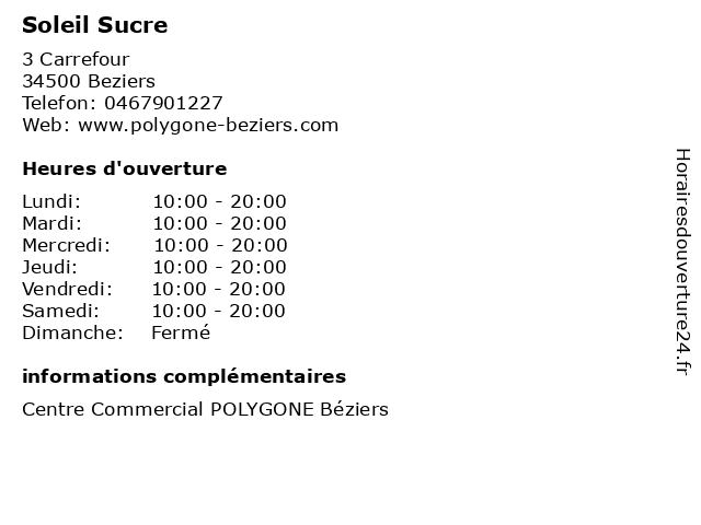 1 Agence Gai Soleil (Distance: 0,38 km) 17 Place du Marché, 34440 Nissan-lez-Enserune agence, gai, soleil 2 Au Soleil Gourmand (Distance: 4,46 km) 15 rue du Pin, 34310 Montady au, boulangerie, gourmand, pâtisserie, salé, soleil, sucré, viennoiserie 4 Soleil Sucré (Distance: 9,24 km) 3 Carrefour Hours, 34500 Beziers cafe, chaussures, enfants, homme, mode femme, restaurant, soleil, sucré 5 Fruits Du Soleil (Distance: 12,39 km) Lieu Dit Le Causse De Falgaira, 34410 Serignan fruits, restaurants, soleil 6 |