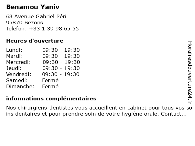 1 Dr Yaniv Danino - Chirurgien-dentiste (Distance: 8,99 km) 6 Place de la République Dominicaine, 75017 Paris chirurgien, consultation, danino, dentiste, docteur, dr, med, médecin, traitement, yaniv 2 Dr Yaniv Danino - Chirurgien-dentiste (Distance: 8,99 km) 6 Place de la République Dominicaine, 75017 Paris chirurgien, consultation, danino, dentiste, docteur, dr, med, médecin, traitement, yaniv 3 Anaelle Benamou - Audioprothésiste (Distance: 9,51 km) 7 Rue des Coches, 78100 Saint-Germain-en-Laye anaelle, audio, audio2000, audioprothésiste, audition, benamou, oreille 4 Maître Eric Benamou - Avocat (Distance: 10,12 km) 89 Boulevard Haussmann, 75008 Paris avocat, avocats, benamou, cabinet, conseils, contentieux, eric, juridique, justice, litiges, maître, services 5 Dr Luc Benamou - Chirurgien-dentiste (Distance: 11,53 km) 5 Place Pierre Brossolette, 92310 Sèvres benamou, chirurgien, dentaire, dentiste, dr, implantologie, luc, parodontologie 6 Dr Yaniv Danino - Chirurgien-dentiste (Distance: 13,69 km) 22 Rue Gabrielle Josserand, 93500 Pantin chirurgien, consultation, danino, dentiste, docteur, dr, med, médecin, traitement, yaniv |