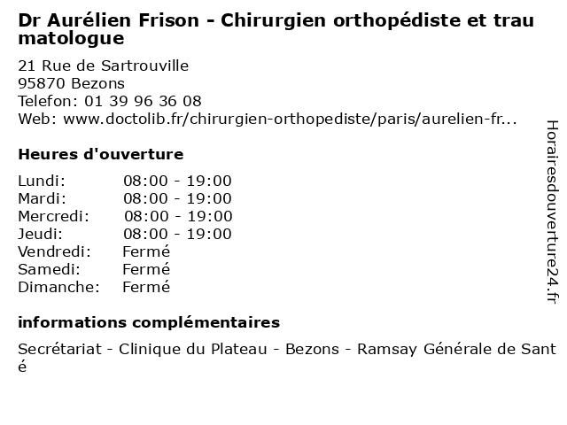 1 Dr Aurélien Frison - Chirurgien orthopédiste et traumatologue (Distance: 10,72 km) 37 Rue Molitor, 75016 Paris aurélien, chirurgien, consultation, docteur, dr, et, frison, med, médecin, orthopédiste, traitement, traumatologue 2 Dr Aurélien Frison - Chirurgien orthopédiste et traumatologue (Distance: 10,72 km) 37 Rue Molitor, 75016 Paris aurélien, chirurgien, dr, et, frison, orthopédiste, traumatologue 3 Dr Laurent Casabianca - Chirurgien orthopédiste et traumatologue (Distance: 0,00 km) 21 Rue de Sartrouville, 95870 Bezons casabianca, chirurgien, dr, et, laurent, médecins, médicaments, orthopédiste, santé, secrétariat, spécialiste, traumatologue 4 Dr Samuel Poulain - Chirurgien orthopédiste et traumatologue (Distance: 0,00 km) 21 Rue de Sartrouville, 95870 Bezons chirurgien, docteur, dr, et, medecin, orthopédiste, poulain, samuel, sante, services, traumatologue 5 Dr Matthieu Meyer - Chirurgien orthopédiste (Distance: 0,03 km) 21 Rue de Sartrouville, 95870 Bezons chirurgie, chirurgien, dr, general, matthieu, meyer, orthopédiste, soins 6 Medecin Elvira Conti (Chirurgien orthopédiste et traumatologue) (Distance: 3,55 km) 22 Rue de la Liberté, 95100 Argenteuil chirurgien, conti, docteur, elvira, et, medecin, orthopédiste, sante, services, traumatologue |
