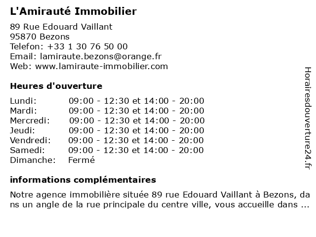 1 L'Amirauté Immobilier (Distance: 4,32 km) 8 avenue de la République, 78500 Sartrouville agence, appartement, gestion, immobilier, l'amirauté, location, maison, transactions, vente 2 L'Amirauté Immobilier (Distance: 4,43 km) 69 avenue de la République, 78500 Sartrouville agence, appartement, gestion, immobilier, l'amirauté, location, maison, transactions, vente 3 L'Amirauté Immobilier (Distance: 5,23 km) 75 rue de Paris, 78600 Maisons Laffitte agence, gestion, immobilier, l'amirauté, location, transactions, vente 4 Human Immobilier (Distance: 0,05 km) 97 Rue Edouard Vaillant, 95870 Bezons achats, agence, appartements, human, immobilier, immobilière, location, ventes 5 Tli Immobilier (Distance: 0,08 km) 101 rue Edouard Vaillant, 95870 Bezons agence, gestion, immobilier, location, tli, transactions, vente 6 Agence Actif Immobilier (Distance: 0,15 km) 113 rue Edouard Vaillant, 95870 Bezons achat, actif, agence, appartements, immobilier, location, maisons, vente |