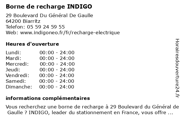 1 Borne de recharge INDIGO (Distance: 0,12 km) 15 Place Georges Clemenceau, 64200 Biarritz borne, de, indigo, recharge 2 Borne de recharge INDIGO (Distance: 0,26 km) 5 Boulevard Du Général De Gaulle, 64200 Biarritz borne, de, indigo, recharge 3 Borne de recharge INDIGO (Distance: 0,30 km) 16 Avenue Du Maréchal Foch, 64200 Biarritz borne, de, indigo, recharge 4 Borne de recharge INDIGO (Distance: 0,37 km) 2 Place Sainte-eugénie, 64200 Biarritz borne, de, indigo, recharge 5 Borne de recharge INDIGO (Distance: 0,44 km) 5 Rue Beau Séjour, 64200 Biarritz borne, de, indigo, recharge 6 Borne de recharge INDIGO (Distance: 0,53 km) 12 Avenue François Mauriac, 64200 Biarritz borne, de, indigo, recharge |