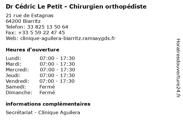 1 Dr Robert Bouvet - Chirurgien orthopédiste (Distance: 0,00 km) 21 rue de Estagnas, 64200 Biarritz bouvet, chirurgien, consultation, docteur, dr, med, médecin, médecine, orthopédiste, robert, traitement 2 Dr Victor Falaise - Chirurgien orthopédiste (Distance: 0,00 km) 21 rue de Estagnas, 64200 Biarritz chirurgien, consultation, docteur, dr, falaise, med, médecin, médecine, orthopédiste, traitement, victor 3 Dr Stéphane Lemoine - Chirurgien orthopédiste (Distance: 0,00 km) 21 rue de Estagnas, 64200 Biarritz chirurgien, consultation, docteur, dr, lemoine, med, médecin, médecine, orthopédiste, stéphane, traitement 4 Le Petit Siam (Distance: 0,52 km) 111 Avenue De La Marne, 64200 Biarritz bar, bistro, bistrot, brasserie, café, le, petit, pub, restaurant, restauration, resto, siam 5 Le Petit Casino (Distance: 0,62 km) 28 Avenue de la Reine Nathalie, 64200 Biarritz alimentation, boisson, by, casino, le, petit, superettes, épicerie 6 Dr Guillaume Petit - Chirurgien-dentiste (Distance: 1,61 km) 5 Rue du Helder, 64200 Biarritz chirurgien, dent, dentiste, docteur, dr, guillaume, petit, soins |