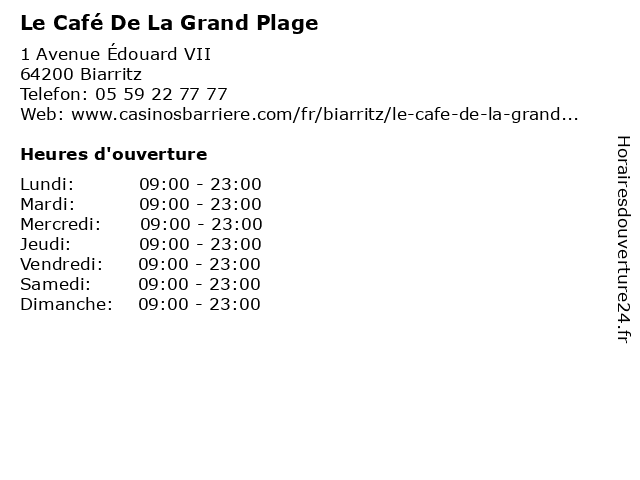 1 Le Bar De La Plage (Distance: 0,02 km) 29 boulevard du Général de Gaulle, 64200 Biarritz bar, cuisine, de, la, le, les boissons, plage, restaurants, restauration 2 Le Café de la Baleine (Distance: 0,06 km) 31 Avenue John Fitzgerald Kennedy, 64200 Biarritz baleine, brunch, café, cuisine, de, déjeuner, la, le, restaurant, restauration 3 Bleu Café (Distance: 0,16 km) . Quai de la Grande Plage, 64200 Biarritz bleu, cafe, café, nourrriture, restaurants 4 Hôtel Mercure Président Biarritz Plage (Distance: 0,16 km) 18 Place Georges Clemenceau, 64200 Biarritz biarritz, hôtel, mercure, plage, président 5 Milwaukee Café (Distance: 0,19 km) 2 rue du Helder, 64200 Biarritz cafe, café, milwaukee, restaurants, restauration 6 Milwaukee Café (Distance: 0,19 km) 2 rue du Helder, 64200 Biarritz brasserie, cafe, café, milwaukee, restaurants |