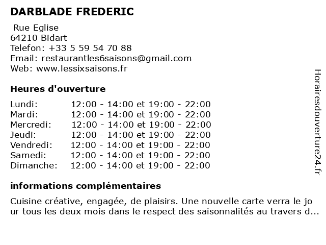 | Dimanche | 12:00-14:00 et 19:00-22:00 |