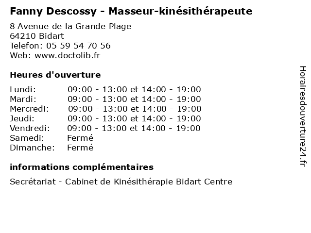 1 Fanny Allardi - Thérapeute (Distance: 5,74 km) 83 Avenue du Maréchal Juin, 64200 Biarritz allardi, couple, famille, fanny, psychothérapeute, thérapeute 2 Fanny Lacoste - Psychologue (Distance: 6,01 km) 113 Avenue d'Espagne, 64600 Anglet fanny, lacoste, psy, psychiatre, psychologue, sante, soins 3 Fanny Arques - Ostéopathe (Distance: 6,37 km) 1 Allée des Jardins d'Arcadie, 64600 Anglet arques, fanny, ostéo, ostéopathe, ostéopathes, soins 4 Dr Fanny Sanguinet - Rhumatologue (Distance: 9,52 km) 6 Chemin de la Marouette, 64100 Bayonne dr, fanny, rhumatisme, rhumatologue, sanguinet, sante, soins 5 Dr Fanny Henaff - Pédiatre (Distance: 10,06 km) 13 Avenue de l'Interne Jacques Loeb, 64100 Bayonne consultation, docteur, dr, fanny, henaff, med, médecin, pédiatre, traitement 6 Dr Fanny Menard - Médecin biologiste (Distance: 10,18 km) 13 Avenue de l'Interne Jacques Loeb, 64100 Bayonne biologiste, consultation, docteur, dr, fanny, med, menard, médecin, médecine, traitement |