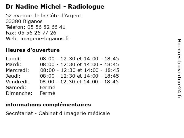 1 Dr Nadine Lebiez - Radiologue (Distance: 0,04 km) 52 Avenue de la Côte d’Argent, 33380 Biganos consultation, docteur, dr, lebiez, med, médecin, nadine, radiologue, traitement 3 Michel Carchereux - Ostéopathe (Distance: 7,42 km) 22 Allée Montaigne, 33470 Gujan-Mestras carchereux, michel, ostéo, ostéopathe, ostéopathes, soins 4 Médiathèque Michel Bézian (Distance: 8,13 km) . Allée Mozart, 33470 Gujan-Mestras bézian, club lecture, michel, médiathèque, rencontre cine-club 5 6 Boulangerie Pâtisserie Suy Michel (Distance: 11,40 km) 1 rue Daniel Digneaux, 33380 Marcheprime alimentation, baguette, boulangerie, commerce, gâteaux, marcheprime, michel, pain, pâtisserie, suy |