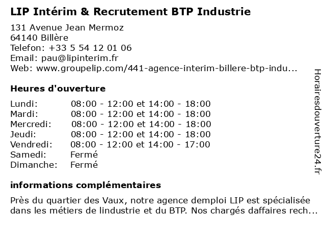 1 Adéquat - Intérim & Recrutement (Distance: 0,24 km) 115 Avenue Jean Mermoz, 64140 Billière adéquat, agence, emploi, fixe, interim, intérim, recherche, recrutement, temporaire 2 Bps Intérim (Distance: 0,48 km) 85 Avenue Jean Mermoz, 64140 Billère agence, aide, bps, emploi, intérim, offres, partiel, temporaire 3 Triangle Intérim (Distance: 0,91 km) 41 Avenue Jean Mermoz, 64000 Pau embauche, emploi, intérim, recrutement, triangle 5 Arobase Recrutement (Distance: 1,53 km) 6 bis Boulevard Champetier de Ribes, 64000 Pau arobase, cabinet, conseil, humaines, recrutement, ressources 6 Agence d'intérim Randstad - Pau (Distance: 1,57 km) 23 Rue Ronsard, 64000 Pau agence, agence intérim, agence pour l'emploi, conseils en recrutement, d'intérim, guide des salaires, offres d'emploi, pau, randstad, recrutement intérim |