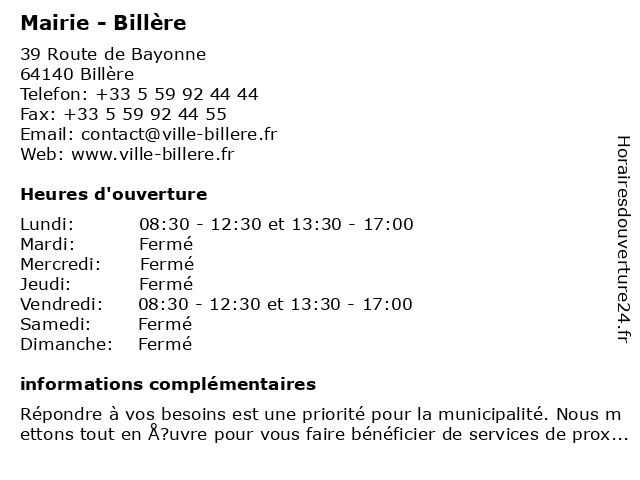 1 École Elémentaire Publique Mairie (Distance: 0,21 km) . Impasse Nederpelds, 64140 Billère cours, education, elémentaire, mairie, publique, services, école, élémentaire 2 École Maternelle Publique Mairie (Distance: 0,21 km) - Impasse Nederpelds, 64140 Billère cours, education, mairie, maternelle, publique, services, école 3 Point Info Famille (Distance: 0,60 km) . Avenue de Verdun, 64140 Billère administration, assoc public, famille, info, mairie, point 4 Mairie de Jurançon (Distance: 1,73 km) 6 Rue Charles-de-Gaulle, 64110 Jurançon administration, assoc public, de, jurançon, mairie 5 Mairie de Bielle (Distance: 7,00 km) 2 Pau, 64260 Bielle administration, assoc public, bielle, de, mairie 6 Mairie d'Aussevielle (Distance: 8,96 km) 4 Village, 64230 Aussevielle administration, assoc public, d'aussevielle, mairie |