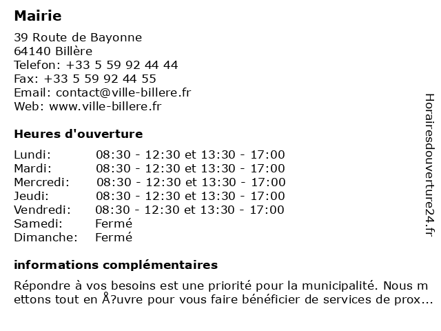 2 École Elémentaire Publique Mairie (Distance: 0,21 km) . Impasse Nederpelds, 64140 Billère cours, education, elémentaire, mairie, publique, services, école, élémentaire 3 École Maternelle Publique Mairie (Distance: 0,21 km) - Impasse Nederpelds, 64140 Billère cours, education, mairie, maternelle, publique, services, école 4 Point Info Famille (Distance: 0,60 km) . Avenue de Verdun, 64140 Billère administration, assoc public, famille, info, mairie, point 5 Mairie de Jurançon (Distance: 1,73 km) 6 Rue Charles-de-Gaulle, 64110 Jurançon administration, assoc public, de, jurançon, mairie 6 Mairie de Bielle (Distance: 7,00 km) 2 Pau, 64260 Bielle administration, assoc public, bielle, de, mairie |