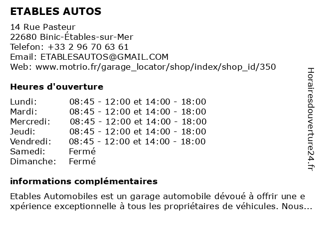 1 Etables Automobiles - Motrio (Distance: 0,02 km) 14 Rue Pasteur, 22680 Binic-Étables-sur-Mer automobiles, etables, garage auto à proximité, garage automobile, garage binic-étables-sur-mer, garage motrio binic-étables-sur-mer, garage motrio à proximité, garage multimarque, garage à proximité, motrio, pneus motrio, promo motrio, rendez-vous garage 2 Bricorama Etables (Distance: 1,65 km) 18 Rue de la Roche Garde, 22680 Étables-sur-Mer bricorama, etables 3 Mr.Bricolage Etables sur Mer (Distance: 1,65 km) 18 Rue de la Roche Garde, 22680 Binic-étables-sur-mer etables, mer, mr.bricolage, sur 4 Centre Equestre D'etables Sur Mer EARL (Distance: 1,66 km) Chemin de Gacon, 22680 Binic-Étables-sur-Mer centre, d'etables, earl, equestre, mer, sur 5 Binic-Etables-sur-Mer Tourisme (Distance: 2,91 km) 6 Place le Pommelec, 22520 Binic-Étables-sur-Mer binic, binic-etables-sur-mer, etables, mer, office, sur, tourisme 6 VPN Autos Saint-Brieuc (Distance: 9,92 km) 27 Rue Hélène Boucher, 22190 Plérin achat voiture, annonce voiture, autos, brieuc, entretien voiture, entretien véhicule, occasion automobile, rachat voiture, réparation voiture, saint, vente de voiture d'occasion, vente de véhicules en ligne, voiture au meilleur prix, vpn |