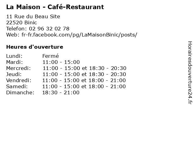 | Vendredi | 11:00-15:00 et 18:00-21:00 |