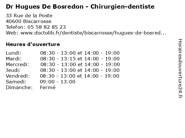 1 Dr Hugues de Bosredon - Chirurgien-dentiste (Distance: 24,82 km) 55 Impasse du Bosquet, 33260 La Teste-de-Buch bosredon, chirurgien, de, dentaire, dentiste, dr, hugues, implantologie, parodontologie 2 Amélie BOSREDON - BELAM Agence Immobilière (Distance: 38,51 km) 20 Avenue de Piclaouey, 33950 Lège-Cap-Ferret agence, amélie, belam, bosredon, immobilière 3 Dr.Hugues Sangibaud- Médecine générale (Distance: 41,27 km) 21 Avenue De La Liberation, 33740 Ares consultation, docteur, dr.hugues, générale, médecine, sangibaud, santé 4 Dr Hugues Angibaud - Médecin généraliste (Distance: 41,42 km) 21 Avenue de la Libération, 33740 Ares angibaud, consultation, docteur, dr, généraliste, hugues, médecin, médecins, santé, secrétariat 5 Dr Hugues Saint-Amand - Médecin généraliste (Distance: 57,96 km) 153 Avenue du Général Leclerc, 33600 Pessac amand, consultation, docteur, domicile, dr, en, générale, généraliste, hugues, médecin, médecine, médecins, saint, santé, visite 6 Dr Adrien Maury-Salel - Chirurgien-dentiste (Distance: 0,05 km) 33 Rue de la Poste, 40600 Biscarrosse adrien, chirurgien, dent, dentiste, docteur, dr, maury, salel, soins |