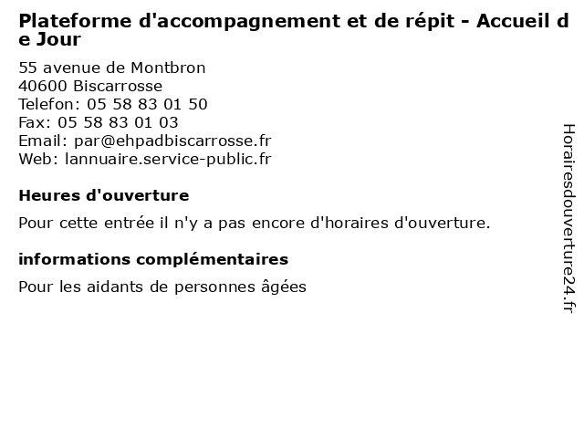 Termes de recherche pour Plateforme d'accompagnement et de répit - Accueil de Jour:et, les, de, biscarrosse, administration, services, jour, pour, accueil, plateforme, publics, personnes, âgées, d'accompagnement, repit, aidants, organismes |
