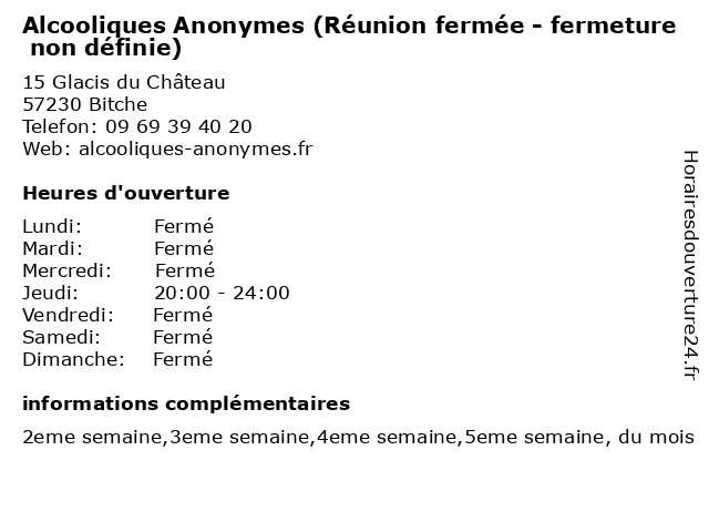 1 Alcooliques Anonymes (Réunion ouverte - fermeture non définie) (Distance: 0,00 km) 15 Glacis du Château, 57230 Bitche alcooliques, anonymes, définie, fermeture, fermée, non, ouverte, réunion 2 Alcooliques Anonymes (Réunion fermée - fermeture non définie) (Distance: 37,10 km) - Place du Maire Ernest Strasser, 67500 Haguenau alcooliques, anonymes, définie, fermeture, fermée, non, réunion 3 Alcooliques Anonymes (Réunion ouverte - fermeture non définie) (Distance: 41,10 km) 22 Sainte-Croix, 57600 Forbach alcooliques, anonymes, définie, fermeture, fermée, non, ouverte, réunion 4 Alcooliques Anonymes (Réunion fermée - fermeture non définie) (Distance: 41,10 km) 22 Sainte-Croix, 57600 Forbach alcooliques, anonymes, définie, fermeture, fermée, non, réunion 5 Alcooliques Anonymes (Réunion fermée - fermeture non définie) (Distance: 57,05 km) 6 Rue du Temple Neuf, 67000 Strasbourg alcooliques, anonymes, définie, fermeture, fermée, non, réunion 6 Alcooliques Anonymes (Réunion ouverte - fermeture non définie) (Distance: 57,05 km) 6 Rue du Temple Neuf, 67000 Strasbourg alcooliques, anonymes, définie, fermeture, non, ouverte, réunion |
