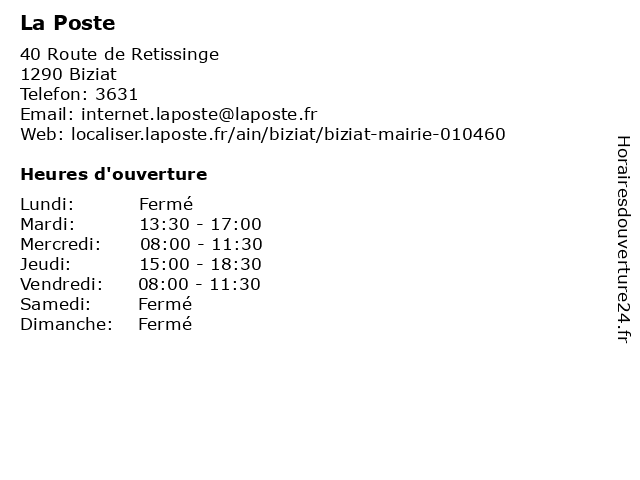 1 La Poste (Distance: 3,67 km) 56 Rue Claude Morel, 01540 Vonnas express chronopost, la, poste, réexpédition internationale 2 La Poste (Distance: 6,84 km) 144 Rue du Menthon, 01380 Saint-Cyr-sur-Menthon express chronopost, la, poste, réexpédition internationale 3 La Poste (Distance: 7,69 km) - Rue de la Poste, 01400 Condeissiat express chronopost, expédition, la, poste, réception des envois, réexpédition internationale, timbres 4 La Poste (Distance: 8,15 km) 41 Place du Marché, 01660 Mezeriat colis, courrier, envoi, expédition, la, lettre, poste 5 La Poste (Distance: 10,13 km) - Rue Condamnale, 01380 Bâgé-le-Châtel express chronopost, la, poste, réexpédition internationale 6 La Poste (Distance: 10,87 km) - Place de l'Hôtel de Ville, 01990 Saint-Trivier-sur-Moignans agence, colis, courriers, expédition, la, postale, poste, relais |