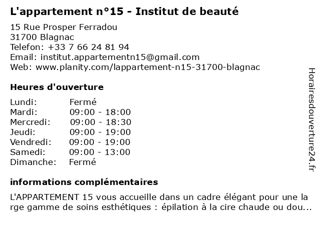 1 Les Belles Années - Campus 15 (Distance: 4,65 km) 15 Barriere de Lombez, 31300 Toulouse 15, années, belles, campus, les, logement, résidence, student, universitaire, étudiant, étudiante 3 Appartement 27 (Distance: 8,01 km) 15 Rue du Commandant l'Herminier,, 31400 Toulouse 27, agence, appartement, marketing, traductions communication, webmarketing 4 Dr Meresse Thomas - (tous les 15 jours) Chirurgie plastique (Distance: 9,57 km) 1 avenue du Professeur Jean Poulhès, 31059 Toulouse 15, chirurgie, docteur, dr, hôpital, jours, les, meresse, médecine, plastique, thomas, tous 5 Office de Tourisme - Du 1er juillet au 15 septembre (Distance: 32,47 km) - Lieu dit Le Grill, 31560 Nailloux 15, 1er, au, de, du, horaires des musées, juillet, office, restaurants, septembre, tourisme, transports 6 Brasserie Club 15 (Distance: 32,67 km) Village Des Marques n 139 140, 31560 Nailloux 15, brasserie, club, fpsp, restaurants |