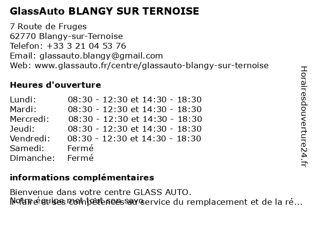1 GlassAuto FRUGES (Distance: 9,39 km) Zone d'activité de la Petite Dimerie, 62310 Fruges fruges, glassauto, lunettes arrières, optiques de phare, remplacement de pare-brise, remplacement vitrage, réparation de pare-brise, réparation vitrage, rétroviseurs, toit ouvrant, vitrage, vitres latérales 2 Fred Fournitures Auto (Distance: 10,99 km) 37 rue d'Arras, 62140 Hesdin auto, automobile, autos, comptoir, de, embrayage, essuyage, fournitures, fred, la, maritime, pieces, pièces, pneumatiques, sa, seine, vente, vitrage, voiture 3 Miroiterie du Ternois (Distance: 11,56 km) 670 Rue d'Hesdin, 62130 Ramecourt du, menuiserie aluminium, miroiterie, ternois, vitrage, vitrerie 4 Mondial Pare-Brise (Distance: 11,73 km) 1 avenue de Boulogne, 62140 Hesdin brise, mondial, pare, pare-brise, remplacement, réparation, services, vitre, voiture, véhicule 5 Carglass (Distance: 11,77 km) 1 Avenue de Boulogne, 62140 Marconne bris, carglass, pare-brise, remplacement 6 Carglass (Distance: 13,30 km) 135 Rue de Béthune, 62130 Saint-Pol-sur-Ternoise bris, carglass, pare-brise, remplacement |
