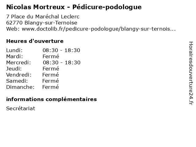 1 Nicolas Mortreux - Pédicure-podologue (Distance: 7,06 km) 200 Rue d'Heuchin, 62134 Anvin mortreux, nicolas, orthoplastie, podologue, pédicure, pédicurie 2 Emmanuel Augris - Pédicure-podologue (Distance: 0,00 km) 7 Place du Maréchal Leclerc, 62770 Blangy-sur-Ternoise augris, emmanuel, pedicure, pied, podologue, pédicure, sante 4 Dr Nicolas Tarissi - Chirurgien orthopédiste (Distance: 10,64 km) 136 Route Départementale, 62140 Marconne chirurgien, consultation, docteur, dr, med, médecin, médecine, nicolas, orthopédiste, tarissi, traitement 5 Camille Rouanet - Pédicure Podologue (Distance: 11,92 km) 176 Rue d’Hesdin, 62130 Gauchin-Verloingt camille, consultation, docteur, med, médecin, médecine, podologue, pédicure, rouanet, traitement 6 Matthieu Mocz - Pédicure-podologue - secretariat (Distance: 18,31 km) 6 Rue Nationale, 62550 Pernes matthieu, mocz, médecin, médecine, médical, pharmaceutique, podologue, pédicure, secretariat, traitement |