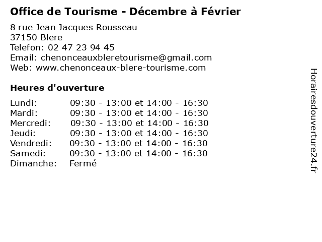 1 Office de Tourisme - Décembre à Février (Distance: 5,54 km) 1 rue Bretonneau, 37150 Chenonceaux de, decembre, décembre, fevrier, février, horaires des musées, office, restaurants, tourisme, transports 2 Office de Tourisme - Juillet et Août (Distance: 0,00 km) 8 rue Jean Jacques Rousseau, 37150 Blere aout, août, de, et, horaires des musées, juillet, office, restaurants, tourisme, transports 3 Office de Tourisme - Mars à Avril (Distance: 0,02 km) 8 rue Jean Jacques Rousseau, 37150 Blere avril, de, horaires des musées, mars, office, restaurants, tourisme, transports 4 Office de Tourisme - Mai à Juin (Distance: 0,02 km) 8 rue Jean Jacques Rousseau, 37150 Blere de, horaires des musées, juin, mai, office, restaurants, tourisme, transports 5 Office de Tourisme - Septembre (Distance: 0,02 km) 8 rue Jean Jacques Rousseau, 37150 Blere de, horaires des musées, office, restaurants, septembre, tourisme, transports 6 Office de Tourisme - Octobre et Novembre (Distance: 0,02 km) 8 rue Jean Jacques Rousseau, 37150 Blere de, et, horaires des musées, novembre, octobre, office, restaurants, tourisme, transports |