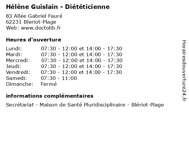 | Lundi | 07:30-12:00 et 14:00-17:30 |