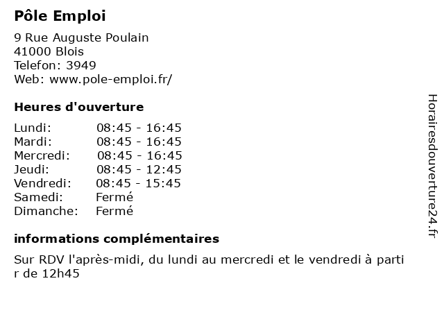 1 Pôle Emploi (Distance: 2,01 km) 67 Avenue de Châteaudun, 41000 Blois administration, agence, candidats, emploi, employeurs, offres, pole, public, publique, pôle, recherche, service, travail 2 Le Lab Pôle d'entreprises d'Agglopolys (Distance: 1,35 km) 3 Rue Roland Garros, 41000 Blois d'agglopolys, d'entreprises, lab, le, pôle 3 Direction départementale de l'emploi, du travail, des solidarités et de la protection des populations (DDETSPP) (Distance: 1,43 km) 34 avenue du Maréchal-Maunoury, 41000 Blois cohesion, ddetspp, de, des, direction, du, départementale, et, l'emploi, la, populations, protection, publique, service, solidarités, travail 4 Samsic Emploi (Distance: 2,85 km) 23 Rue Léon Fournier, 41000 Blois emploi, intérim, recrutement, samsic 5 Solano Emploi (Distance: 3,47 km) 17 rue Nationale, 41260 La Chaussée Saint-Victor agence, cdd, cdi, emploi, formation, intérim, solano, travail 6 Cap Emploi (Distance: 4,68 km) 180 rue Jacquard, 41350 Vineuil administration, cap, cher, emploi, et, loir, organismes, publics, services |