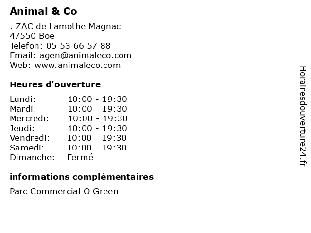2 Animal Factory (Distance: 1,34 km) s/n Avenue du Midi, 47000 Agen animal, animale, factory, magasins, nutrition 3 ER Auto 47 - Garage & Co (Distance: 3,05 km) 1500 Avenue Dr Jean Nogues, 47550 Boé 47, auto, boé, co, er, garage 4 Coiff&Co (Distance: 3,17 km) 4 Rue Jules Ferry, 47000 Agen cheveux, coiff&co, coiffure, esthétique, salon, soins 6 Illy'co Pizza (Distance: 5,40 km) 1 Place de Salens, 47390 Layrac café, illy'co, italien, pizza, pizzas, pizzeria, restaurant, restauration |