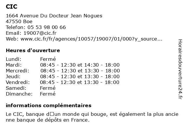 1 CIC (Distance: 4,23 km) 90 Boulevard De La Republique, 47000 Agen cic, compagnie de téléphone, organisme d'assurance 2 CIC (Distance: 19,90 km) 2 Place Jean Baptiste Chaumeil, 82400 Valence D Agen cic, compagnie de téléphone, organisme d'assurance 3 Crédit Industriel et Commercial (CIC) (Distance: 0,01 km) 1664 Avenue du Docteur Jean Nogues, 47550 Boe agence, assurance, bancaire, banque, cic, commercial, crédit, et, industriel 4 CIC Agence (Distance: 3,89 km) 32 COURS DU 14 JUILLET, 47000 AGEN agence, casteljaloux, cic, l'argent, l'épargne, la trésorerie, les banques, les finances, les prêts 5 CIC Agence (Distance: 4,82 km) 19 AVENUE DU GENERAL DE GAULLE, 47000 AGEN agence, casteljaloux, cic, l'argent, l'épargne, la trésorerie, les banques, les finances, les prêts 6 Crédit Industriel et Commercial (CIC) (Distance: 36,48 km) 2 Place Zoppola, 47400 Tonneins agence, assurance, bancaire, banque, cic, commercial, crédit, et, industriel |