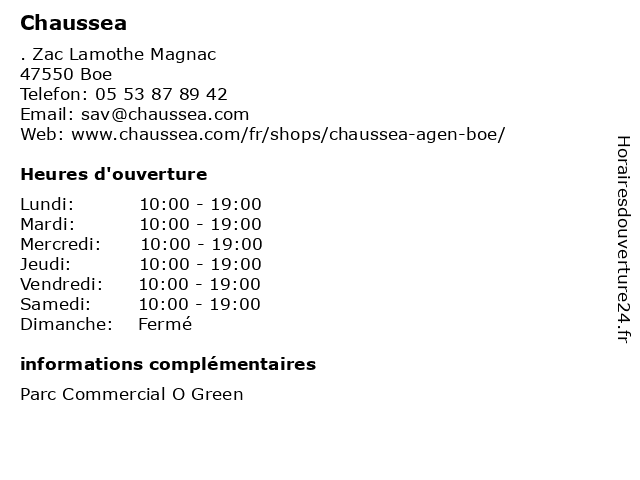 1 Chaussea (Distance: 3,97 km) n/a de lamothe, 47551 Boe accessories, chaussea, leather, men, shoes, women 2 Chaussea (Distance: 32,47 km) 39 avenue des Pyrénées, 32100 Condom accessoires, chaussea, chaussures, cuir, femmes, hommes 6 Courir (Distance: 0,38 km) 7 Allée de Lacapelette, 47550 Boé chaussures, courir, enfant, femme, homme, marques, mode, vêtements |